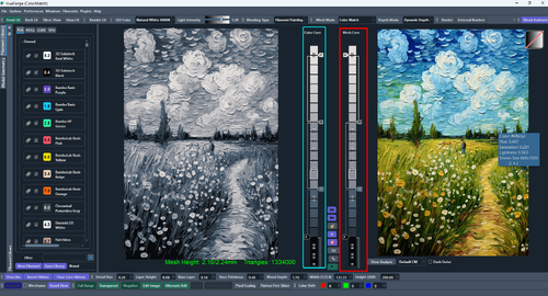 Now let's advance to an image that would be nearly impossible to render satisfactorily in any of the other Mesh Modes, that is the image from the "Van Gogh Style Field.hfp" example in the HueForge/Tools folder.